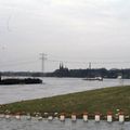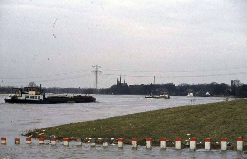 Scheepvaart over de Maas bij hoogwater. Op de achtergrond de kloosters van Steijl.