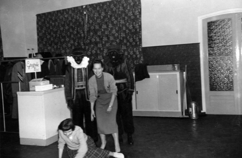 Twee Zwarte Pieten bezoeken de Sint Gabrielchool. De dames ? hebben er duidelijk plezier in.