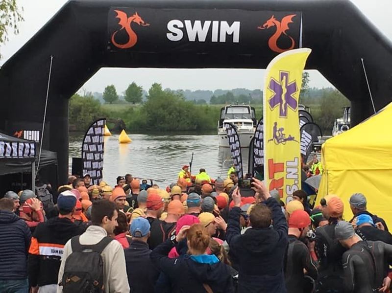 dagen met op de eerste dag het zwemmen, de tweede dag het fietsen en de derde dag het hardlopen. Op de foto de start van het zwemmen welk in de dode Maasarm in Rijkel werd georganiseerd.