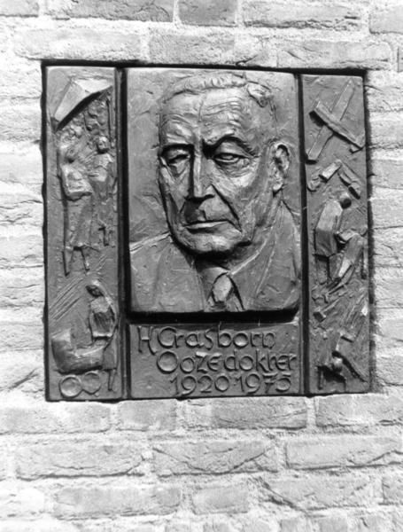 Plaquette van Dr. Harrie Crasborn op de voorgevel van het Groene Kruisgebouw te Beesel. Deze plaquette is een ontwerp van de Swalmense kunstenaar Frans Peeters.