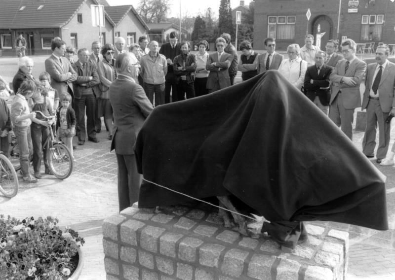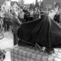 Onthulling standbeeld "de Kleisjteiker" voor kerkplein Offenbeek aan de Keulseweg. Kunstenaar J. Nicolas. Tweede van rechts pastoor Verdonschot. Het beeld wordt later verplaatst naar hoek Keulseweg - Pater Claretstraat.
