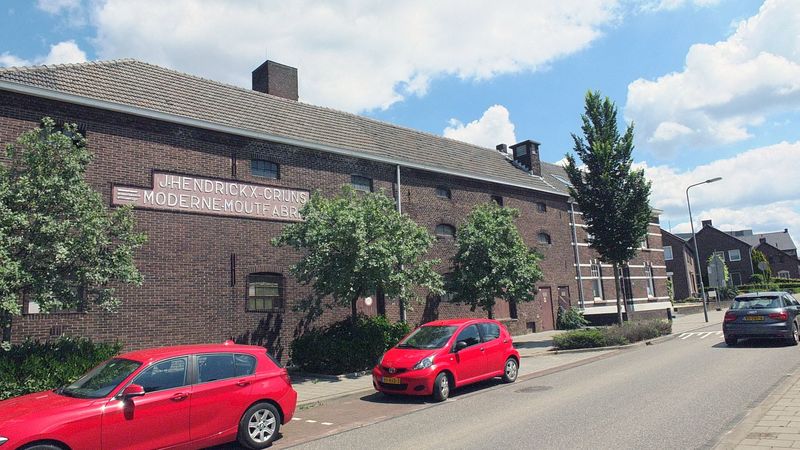 De moutfabriek van Swalmen. De naam van de vorige eigenaren van de moutfabriek, J. Hendrickx - Crijns is in de muur van de fabriek ingemetseld.
