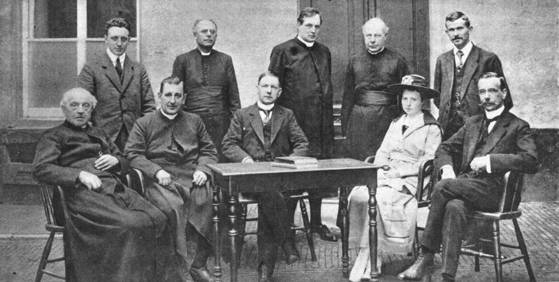 De leden van het comité zijn (in zover aanwezig bij de komst van de fotograaf): zittend van links naar rechts: 1 Mgr. C.C. Prinsen, 2 Professor J.D.J. Aengenent, 3 Secretaris Mr. A. Baron van Wijnbergen, 4 Voorzitter mej. E.C. Broekelman, 5 adj. secretaris Mr. H. v.d.Biesen. Staande 1 NN. 2 NN. 3 NN. 4 Pastoor Jac. Vrancken, 5 NN