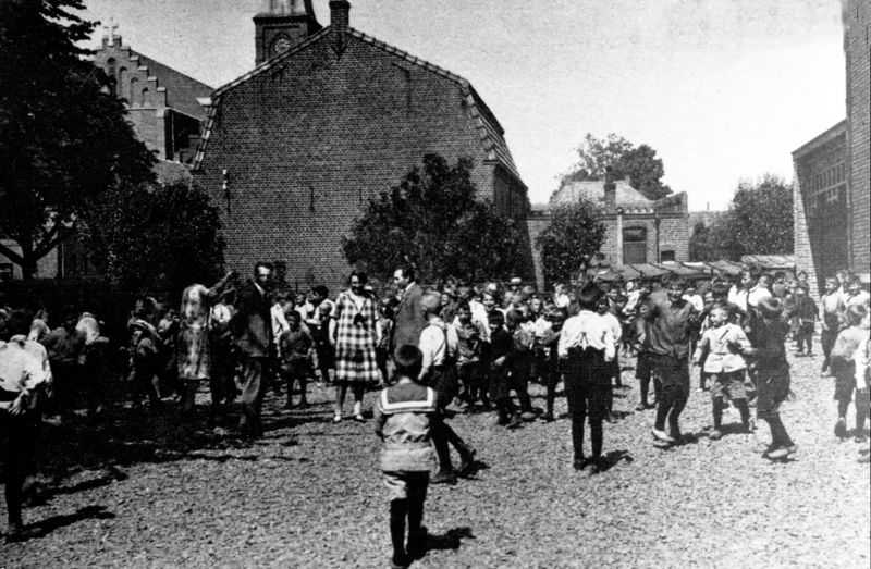 De leerkrachten die we zien waren juffrouw Driekoningen, meester Bosmans, juffrouw Hendriks en meester Korsten. Links zien we de woning van Bors / Julicher