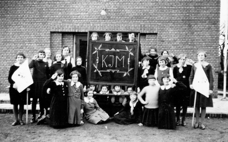 Groepsfoto van de Katholieke Jonge Meisjes (K.J.M.) voor het Piusgebouw.