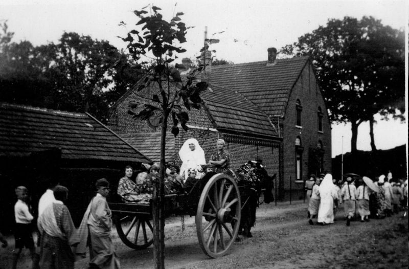 Op de foto zien we kinderen op een kar (paard en wagen) tijdens de kindsheidsoptocht.