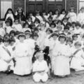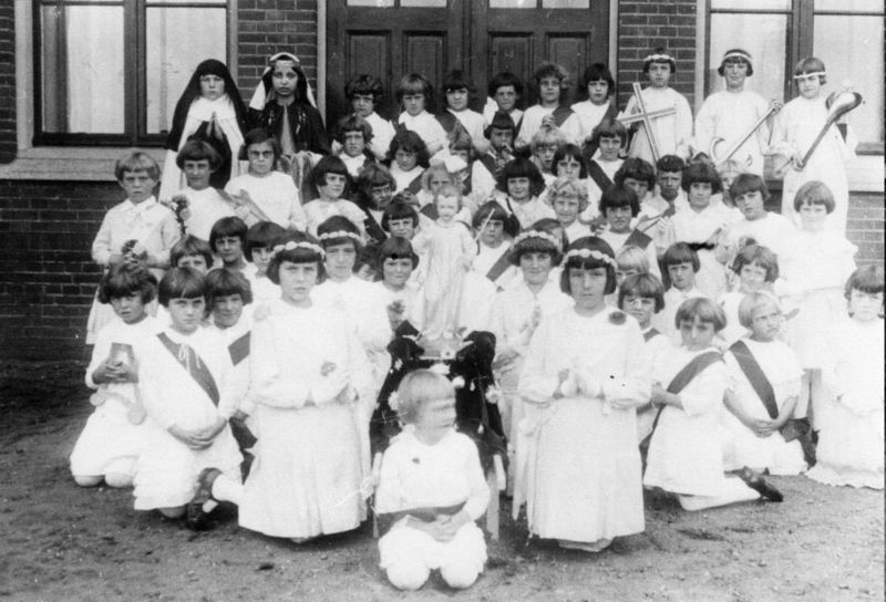 Vanaf het begin van de 20e eeuw, maar vooral vóór de Tweede Wereldoorlog werden er in veel plaatsen (jaarlijkse) optochten georganiseerd, waarin de kinderen verkleed al missionaris, missiezuster, neger, Chinees of indiaan meeliepen. In het midden vooraan zien we op de foto links van het beeld: Mia Spee, Mariel Franssen, Mien Naus. In het midden Grad Nieman. Rechts van het beeld Mina Spee, Gerda Goertz, Mien Willemsen Rechts achteraan staan naast elkaar vlnr. ? Houwen, Gerda Derks en ? Houwen.