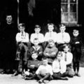 Kapelaan Peeters met een voetbalclubje vóór het patronaat.