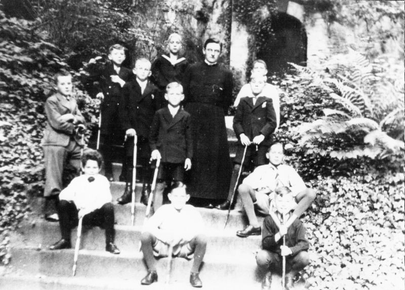 Kapelaan Geurts samen met de misdienaars? tijdens een uitstapje.