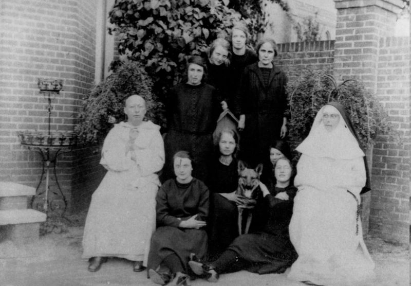 Groepsfoto van leerlingen van de kweekschool met links de rector Elsensohn en rechts zuster Verona Heuskens directeur van de R.K. Kweekschool voor Onderwijzeressen.