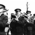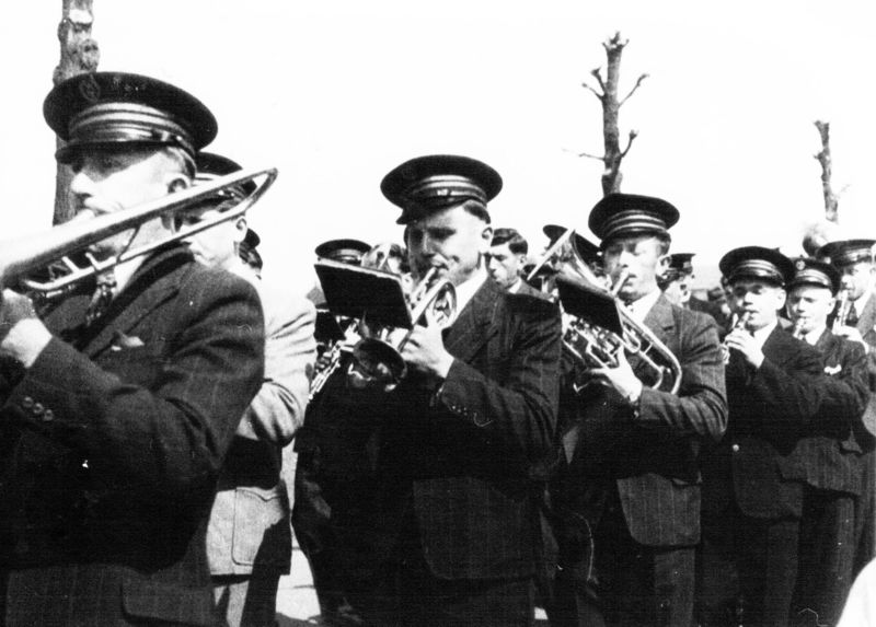 Leden van het Philharmonisch gezelschap tijdens de optocht ter gelegenheid van de eerste heilige mis van Frans Rutten.