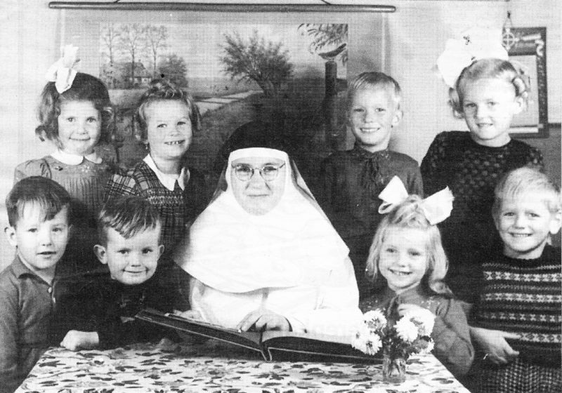 van links naar rechts: achterste rij: 1 Anne v.d. Sterren, 2 Ellie Verdeuzeldonk, 3 Jan Verlijsdonk, 4 Riny Janssen. voorste rij: 1 Jan Pollen, 2 Andrè Dohmen, 3 zuster Thomasita, 4 Loes v.d. Ven, 5 Coen Franssen.