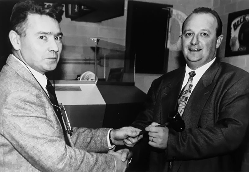 De Voorzitter (1985 tot 1994) van voetbalvereniging V.V. Bieslo, Jan Prins (links) geeft het voorzitterschap over aan de nieuwe voorzitter Piet Levels (1994 tot 2008)