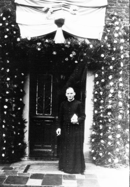Pastoor van de Broek viert zijn 25-jarig priesterfeest. (hier voor de deur van de pastorie)