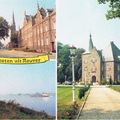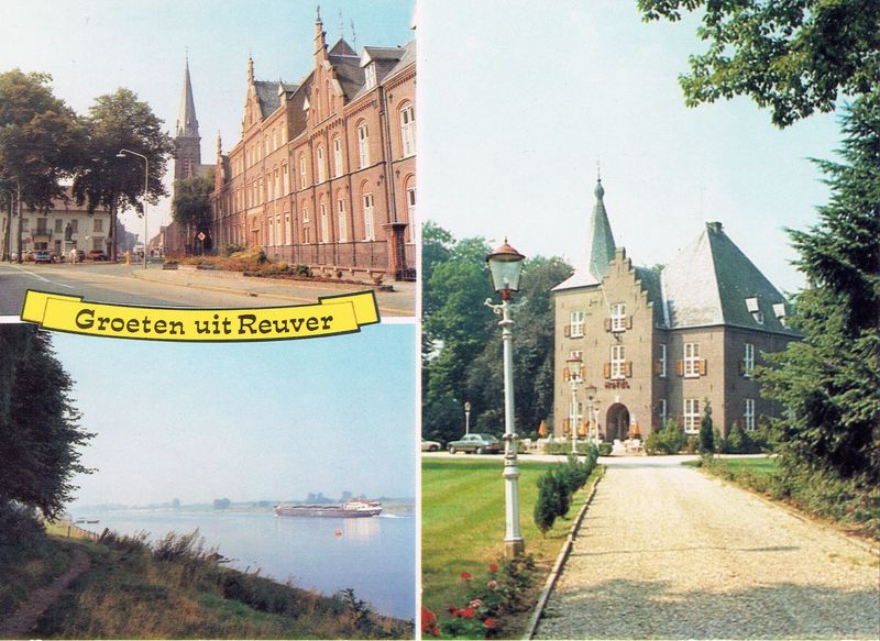 Prentbriefkaart met beelden van Reuver: klooster, kasteel Waterloo en de Maas.