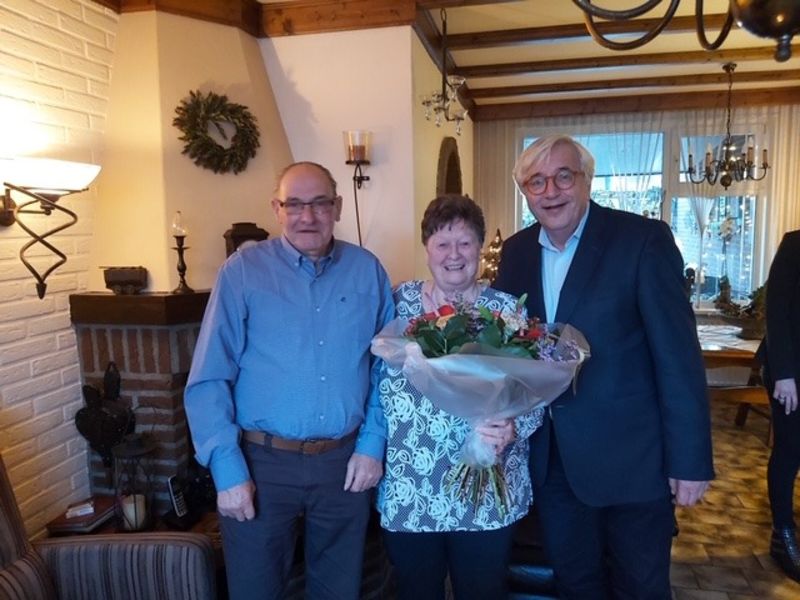 Het echtpaar Hutz-Konings word door waarnemend burgemeester Wil Rutten op een bloemetje getrakteerd voor hun 60 jarig wettelijke huwelijk
