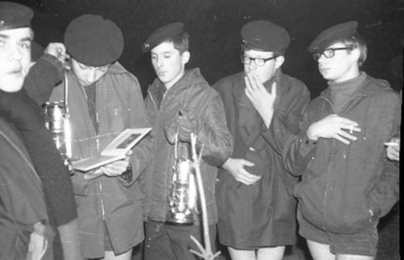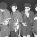 Herderstocht van verkenners van de Sint Lambertusgroep. Met petroleumlampen, verhalenboek en na afloop karboet eten werd in de avond door de bossen van Reuver gewandeld.