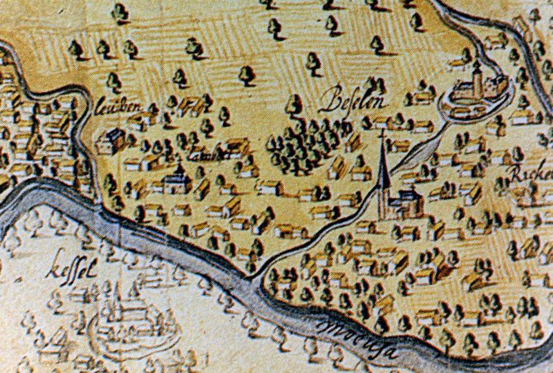 Oudste tekening van de St. Lamberts Capelle. Links Leuben=Leeuwen. We zien waarschijnlijk de Spijker, de Kamp en daartussen het kerkje op de Lambertusheuvel. Rechtsboven Nieuwenbroeck en rechts de kerk van Beesel. De kaart is met veel fantasie getekend.