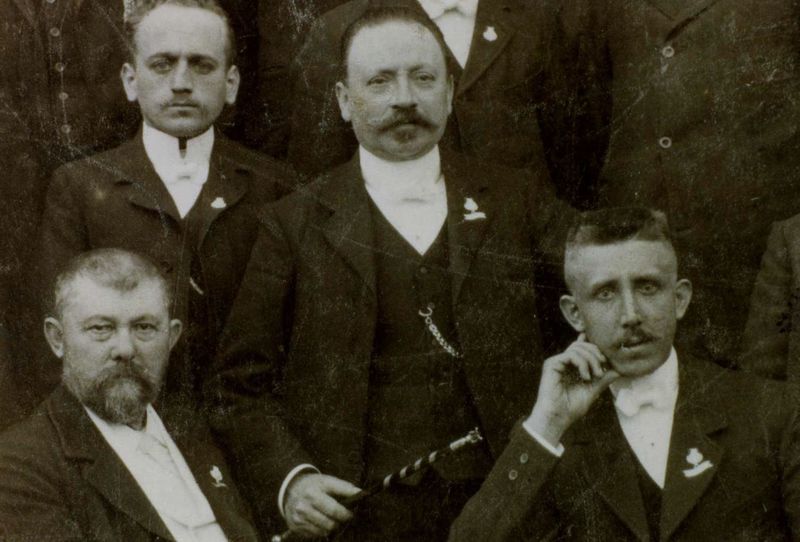 Willem Janssen als bestuurslid van het Mannenkoor Reuver. Hij zit rechts aan tafel met de voorzitter Jos Paquay, zijn zwager. In het midden de dirigent L. Lichtenberg en daarnaast Baer Steeghs (Sigare Baerke). Foto uit 1913 als het Mannenkoor Reuver 10 jaar bestaat.