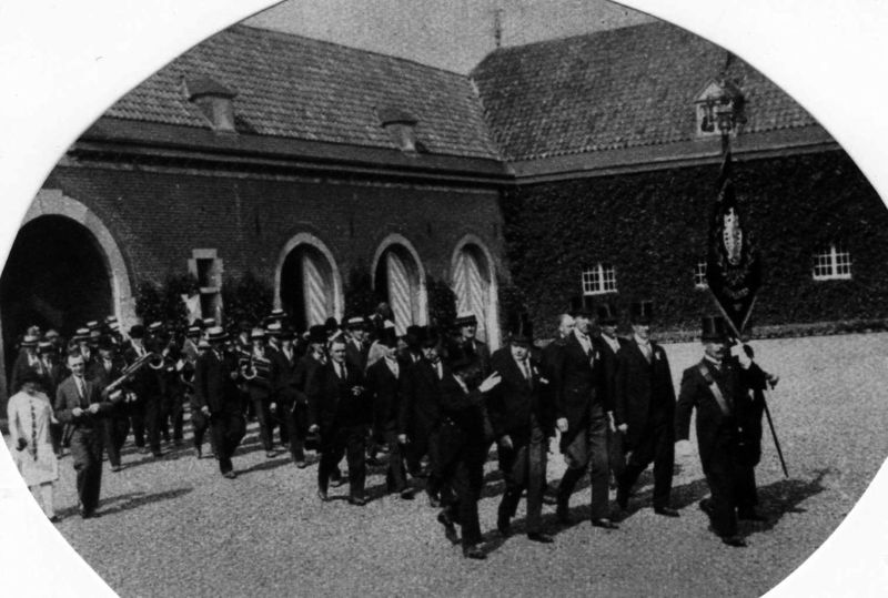 Foto gemaakt t.g.v. het 75-jarig bestaan van harmonie St. Cecilia in Swalmen in juli 1927. Het gezelschap komt aan op Hillenraadt.