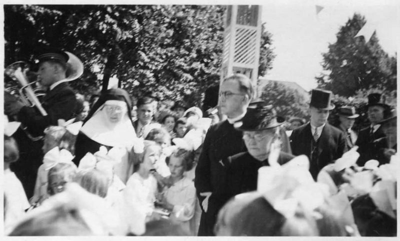 We zien hier Harrie Rijnders op weg naar de kerk begeleid door zijn familie (moeder rechts) en de Philharmonie. Tijdens een toespraak voor de woning van zijn ouders aan de Karel Doormanlaan (langs het kerkhof), zou hij gezegd hebben “Er is maar één Führer en dat is God”. Dit was voldoende om hem een week later te arresteren. Via het Oranjehotel in Scheveningen werd hij naar Dachau getransporteerd, waar hij in september 1942 overleed.