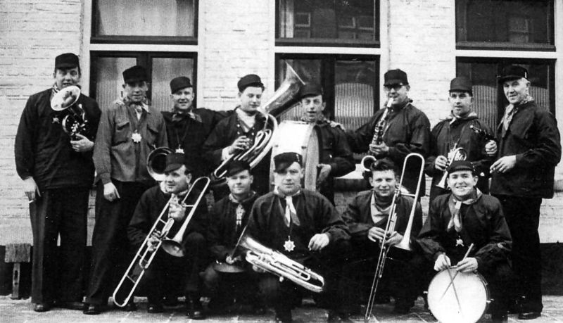 Een foto van de boerenkapel, onderdeel van het Philharmonisch Gezelschap Reuver, rond 1955.