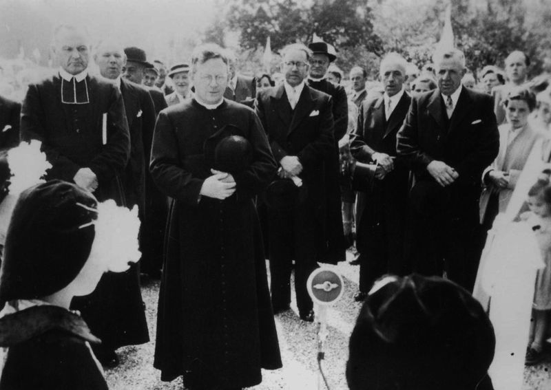 De installatie van pastoor Essers. Achter hem 4 leden van het kerkbestuur: Engel Weyers, Wevers, Peter Killaars, G. Rutten.