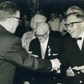 Feest bij het Philharmonisch Gezelschap Reuver. Bér Vossen is 60 jaar lid, Peter Janssen en Hendrik Stinges zijn 50 jaar lid. Linksboven Jan Eggels, bestuurslid