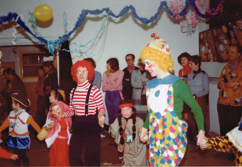 in rood/wit gestreepte trui Mien Smeets (moeder van Irma Smeets), Mariëlle van Diepen (indiaantje), ? mevrouw Straus (moeder van Ghislaine Straus?) – op de achtergrond tegen de muur, v.l.n.r.: in rood wit gestreept shirt moeder van Kristel Hendriks?, echtgenoot van juf Annemie, moeder van juf Annemie (mevrouw Timmermans), met rode coltrui mevrouw Reumkens?, in blauw/wit gestreept shirt onbekend, in gele blouse Daan Smeets (vader van Irma Smeets).
