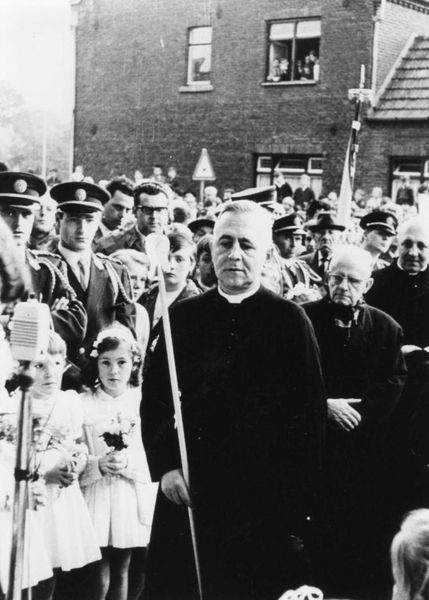 Op de foto is hij aangekomen aan de kerk. Achter hem pastoor Winters van Beesel. Tussen hen in Bér Pouls. Rechts pater Weiss, rector in Offenbeek.