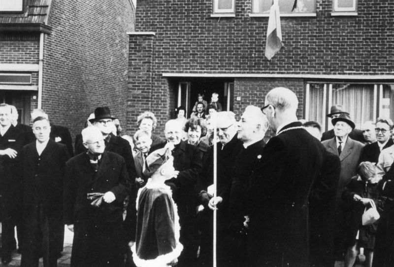 Op 17 oktober 1965 werd P. Geraets geïnstalleerd als pastoor van de St. Lambertusparochie in Reuver. Hij wordt hier toegesproken door een herdertje, die hem de staf overhandigt. Hij staat hier tussen deken G. Stoot en burgemeester G. Mooren.