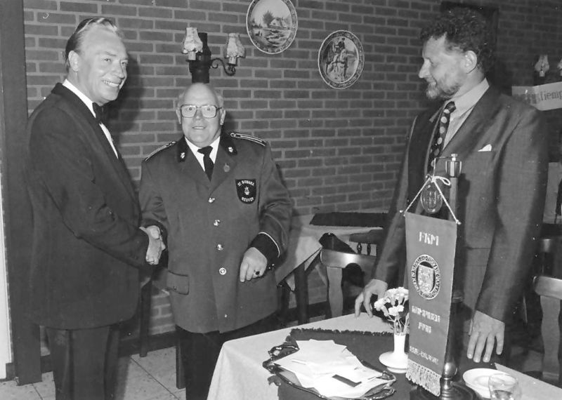 Louis Heinen, president van het Philharmonisch Gezelschap, feliciteert de heer Wilms, voorzitter van het trommel-en fluiterkorps St. Barbara met het behalen van het Nederlands Kampioenschap. Rechts de heer Den Dulk.