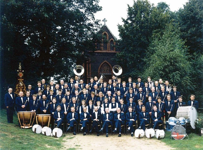 Zittend: Luç Steeghs, Mart Jansen, Piet de Vlieger, jan Vossen (dir.), Louis Heinen (president), Jan Engels, George Paquay, Frans Brands en Nol Wassen. 1e rij: Piet Konings (drapeau), Baer Geerlings, Sjoerd Geerlings, Resi Ickenroth (klarinet), Harrie Meeuwissen, Pierre Houwers, Harrie Wassen, Harrie Willemsen, Connie Wassen, Sandra van Densen, Bianca House, Ron Jeucken, Luc Paquay, Winda Cox, Theo Cuypers, Franka Rijvers, Bart Peters, Loes Theunissen. Lode de Wilde en achter de dikke trom John en Thei Wassen. 2e rij: (te beginnen achter Resi I.) Jos Ramaekers, Willy Ickenroth, Luc Verhaegh, Roel Houwers (de huidige president), Geert Schrijvers, Ingrid Franssen, Carla Schrijvers, Wies Stinges, Drees Rutten Jo Aarts, Freek de Vlieger, Jos Klinkenberg, Herbert van Leipsig, Hans Ramaekers, Niek de Wit. 3e rij: Nol Geerlings, Kees Burger, Marlinde Dings, Har Heymans, Jan Houwers, Sjeng Claessen, Jos Nissen, Jac Heijmans, Jan Stinges, Jac Geerlings, Hans Hendriks, Stefan Geerlings, Wiek Houwers, Theo de Vlieger, Jac Wassen. 4e rij: Lei Nissen, Martin Willemsen, Harrie Holtackers, Geert van de Kerkhof, Ferd Geerlings, Hub Holtackers, Ad de Wit, Jan Hillekens, Jules van Leipsig, Leon Dings, Luud Heinen, Steef Peters, Ton Janssen, Frits Nissen, Willo Naus, Piet Hillekens.