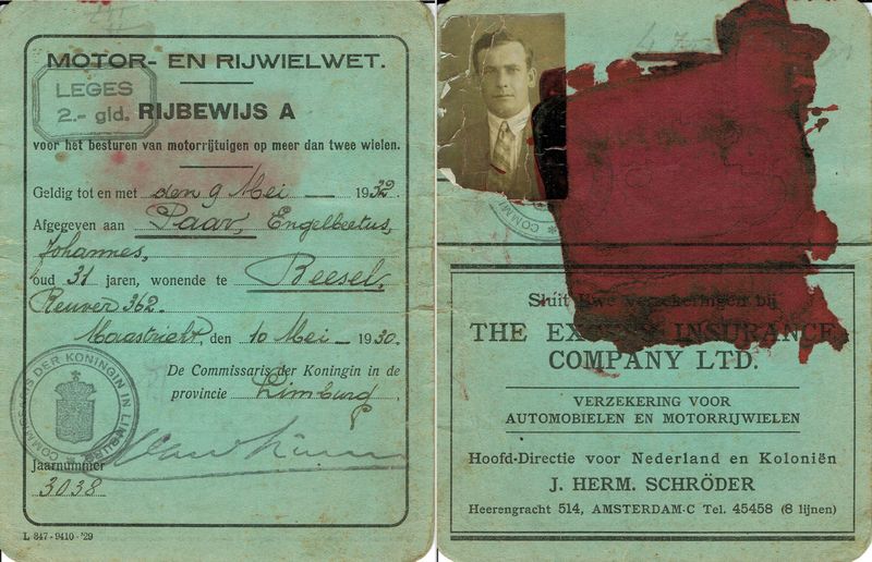 Het rijbewijs van Engelbert Johannes Paar (melkhandelaar) uit Reuver.