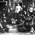 Een groep militairen die verantwoordelijk is voor de grensbewaking in Reuver. Zij waren ondergebracht op Bergerhof bij Peter Sangers, die in de bovenste rij helemaal links staat. Naast hem de schaapsherder (sjieëper) in zijn dienst en de huishoudster alsmede 2 ‘maagden’. De foto is genomen op de binnenplaats van boerderij Bergerhof aan de Bergerhofweg te Reuver, waar nog steeds een veeteeltbedrijf is.