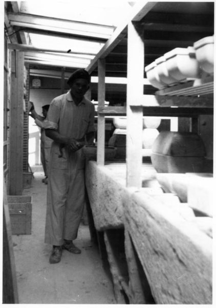 De vormafdeling. Hier worden vormen gemaakt. Gietklei wordt in de vormen voor bloembakken gegoten.