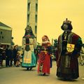 Het reuzenpaar Ties en Lies en hun zoontje Benno tijdens de Boerebroelof.
