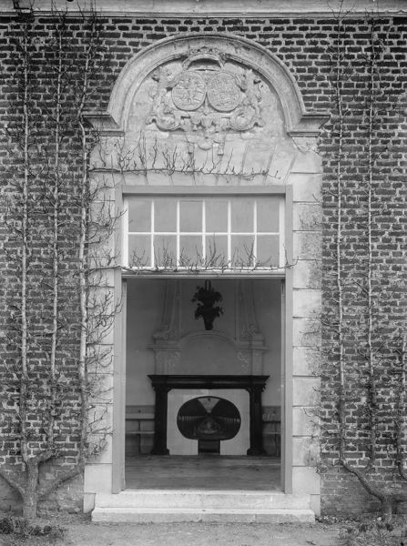 Ingangspartij van het tuinhuis van kasteel Hillenraad met zicht op de schouw .