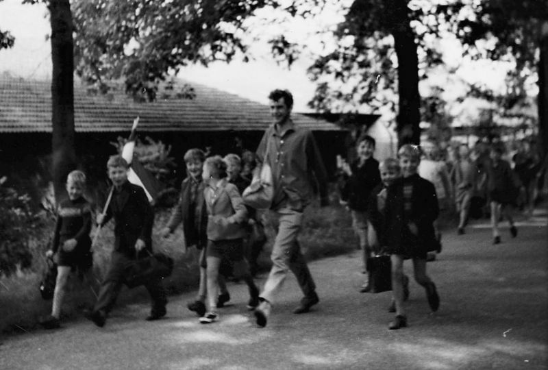 Dankzij een sponsoractie bij Reuverse bedrijven door Van Helden, rijkspolitie, en Van de Pol, marechaussee, beiden lid van het kindervakantiecomité, werd er voldoende geld opgehaald om met de trein te reizen. De Nederlandse Spoorwegen werkten ook mee door af en toe extra treinen in te lassen. Een groepje onder leiding van Jac van de Pol op weg naar het station te Swalmen.