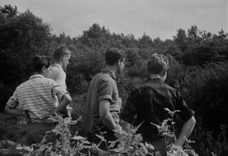 De kinderen spelen in het dal van de Lommerbergen, nu een vijver. Ben Killaars, Cor Crommentuyn, Piet Hillekens en Har Steeghs houden toezicht.