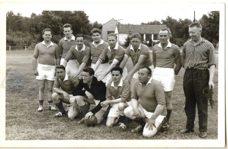 staand vlnr : Wiel ("Walter") Ottenheim, Jac (van Net) Peeters, Pietje Geelen, Hay (van Klómpe-Joep) Stevens, Juup Schoeren ,Jan Schreurs ,Wiel (van Keun) Franssen ,Juup Gommans knielend vlnr : Piet (van de Sjoester) Killaars ,Lei ("Kraak") Gommans ,Thei (van Nuize) Janssen, Piet (van de Zoere) Timmermans