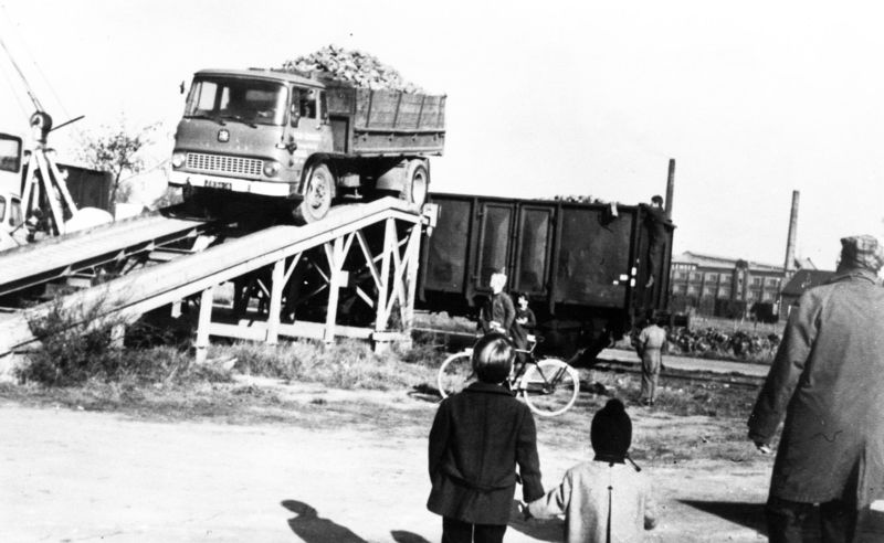 In de zestiger jaren werden de bieten per auto vervoerd naar het raccordement (spooraansluiting) van Laumans in de buurt van De Steenbok (nu Jalema). Hier werden ze overgeladen. Rechts op de rug gezien Sef Cremers, die namens de gemeente toezicht hield. De 2 kinderen zijn van stationschef Vogels.