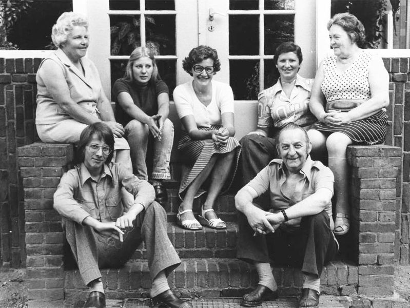 Geheel links op de foto: Mien of Mia Clerks, daarnaast zittend Annie Dijcks, in het midden Nellie Ament, daarnaast Helma Brouns, en geheel rechts Tonnie Berger. Op de onderste treden, Piet Berger, Geheel rechts zittend: Jaak Berger. Namen: Mevr. Helma Nijskens-Brouns