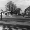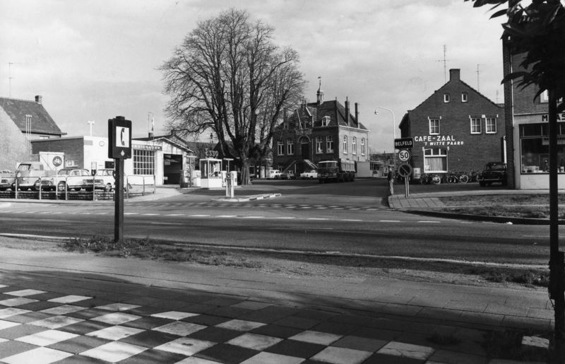 Zicht op de markt in Belfeld met links het garagebedrijf en Esso tankstation van Jacobs, rechts cafè 't Witte Paard en op de achtergrond het Raadhuis.