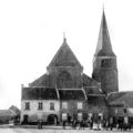 Foto uit 1902 van de markt, afkomstig uit het gemeentearchief van Swalmen. Er werd school gehouden in een gebouwtje waar ook het cachot was. De boog onder dit gebouw leidde naar de kerk.