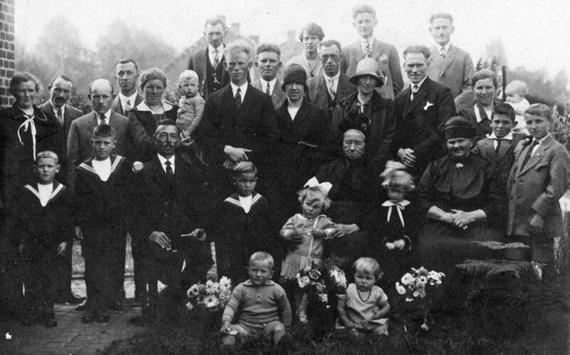 Van links naar rechts voorste rij: 1 Gerardus (Graetje) Janssen,, 2 Agnes Derks (Nes van Theike) 2de rij: 1 Joannes Derks (Jan van Theike) 2 Gerardus Derks (Sjra van Theike) 3 Andreas (Drees) Bloemers 4 Hermanus Derks (Herman van Theike) 5 Lisa Derks (Lies van Theike) 6 Grootmoeder Curvers. 7 Mia Lemmen 8 Elisabeth Teeuwen 9 Paul Derks (Pau van Theike) 10 Gerardus (Graetje) Bloemers 3de en laatste rij rij: 1 Aldegonda (Gon) Jacobs 2 Gerard Janssen (echtgenoot van Aldegonda Jacobs) 3 Lodewijk Lemmen (echtgenoot van Maria Jacobs) 4 Rie Bloemers 5 Maria (Marie) Jacobs 6 Gerardus (Sjraar) Lemmen 7 Antoon Miggels (halfbroer van Arnoldus Jacobs) 8 Arnoldus (Nol) Jacobs 9 Hermanus (Herm) Jacobs 10 Anna-Maria-Josephia Bloemers 11 Joanna van Hooren 12 Joannes (Sjeng) Bloemers 13 Jozef (Sjef) Jacobs 14 Sybilla Jacobs (echtgenote van Hermanus (Herm) Derks15 Hermanus Derks 16 Thei (Theike) Derks 17 Anna Jacobs (echtgenote van Thei Derks) 18 Petronella Derks (Nel van Theike)