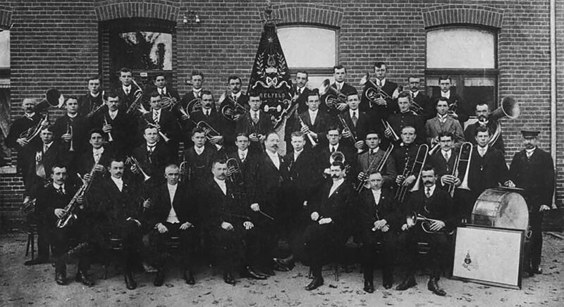 In 1909 werd op initiatief van zangvereniging Kunst Na Arbeid-voorzitter Frits Boonen het fanfarekorps Kunst Na Arbeid opgericht. De foto laat de vereniging zien in 1912.