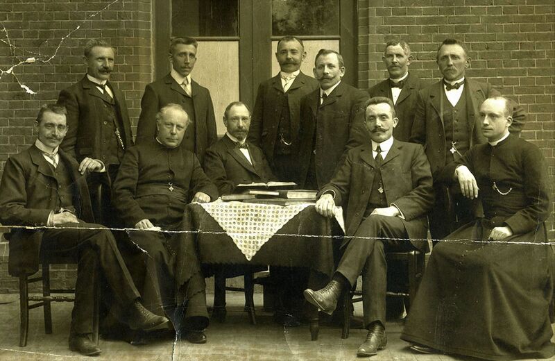 Bestuur van het Kruisverbond afd. Reuver omstreeks 1910. Kruisverbond Reuver-Rooms Katholieke Vereniging tot bestrijding van drankmisbruik, onder patronaat van de H. Lambertus, opgericht 1905. Aantal leden dat jaar: 90. Initiatief van pastoor J. Vrancken.