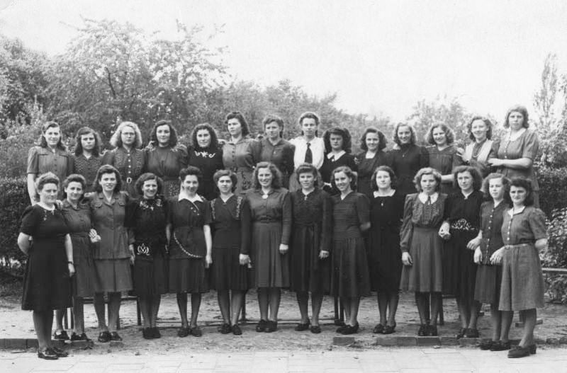 Bovenste rij v.l.n.r.: 1 Mien Smolenaars (gehuwd met Thei van Stalin) 2 Nel Boonen (Nel van Sjarel),3 ?? Rutten (van Rutten-Hein), 4 Deel Janssen (Deel van Bergerhaof), 5 Trui Smolenaars (van Lie van Bergerhaof (Janssen)), 6 Nel Franssen (Nel van Braus), 7 To Rutten (gehuwd met Hand Boonen), 8 ?? Koch, 9 Stien Berden (woonde op boerderij de Weerd) ,10 Leen Franssen (Leen van Keun),11 Truus Niemans (gehuwd met Theo de Vlieger) , 12 Mia Niessen (Mia van Niesses-Frans),13 Mien Keiren,14 ?? Houwers (van de Knoep) Onderste rij v.l.n.r.: 1 Marie Heijer (gehuwd met Boonen), 2 Antje van Dijk (gehuwd met Joep Koch), 3 Maria van Willick (Maria van de Diek gehuwd met Braus Franssen), 4 An Mobers , 5 An Franssen (An van sjlechter Piëter) , 6 Lies Reijnders (Lies van de Sjpieker), 7 ??? onbekend , 8 Bertha van Willick (Bertha van de Diek), 9 ??? onbekend , 10 Annie Spee, 11 Truus Killaars (Truus van Killaars-Sjeng), 12 Miet Rutten, 13 Tilla van der Velden, 14 Mie Berden. namen: Truus Rovers-Niesen en Nellie Rovers-Mobers