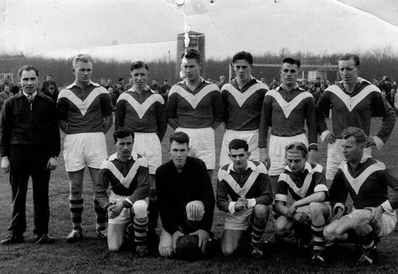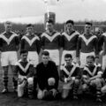 Van links naar rechts: 1. Cas van Buggenum, 2. N.N., 3. Jan Rutten,4. N.N., 5. Fons Fuchs (onderwijzer in Offenbeek), 6....Houwers?, 7. Joep Gommans. Voorste rij: 1. Wiel(?) Kuipers, 2. Piet Vogels (werd keeper bij Fortuna), 3. N.N.,4. Harrie Wassen, 5..... Heldens (de Rooie of de Blauwe). Heeft u namen van de spelers laat het weten.